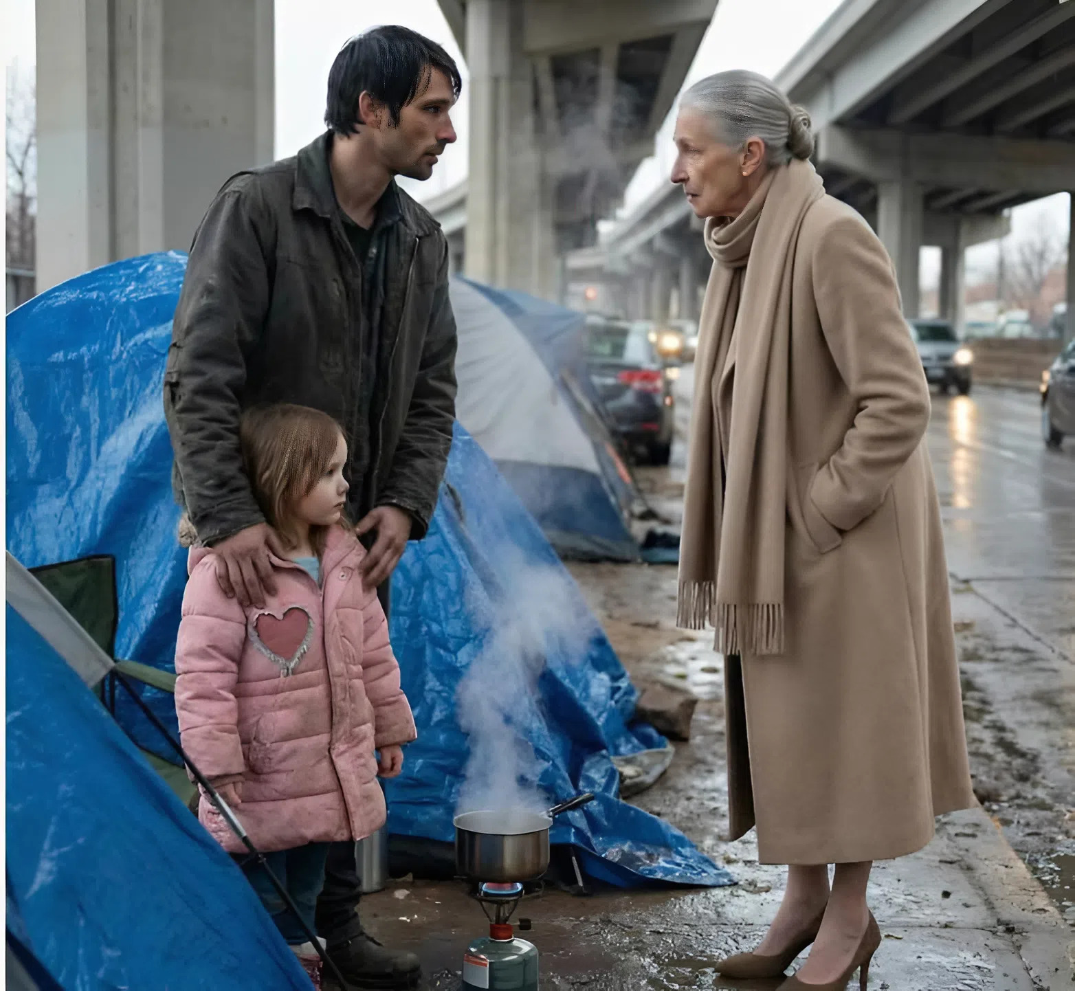 Sygnalizacja świetlna zmieniła się na czerwone światło i kiedy się zatrzymaliśmy, coś przykuło moją uwagę — pod estakadą stłoczyła się grupa namiotów, a niebieskie plandeki trzepotały jak ranne ptaki.