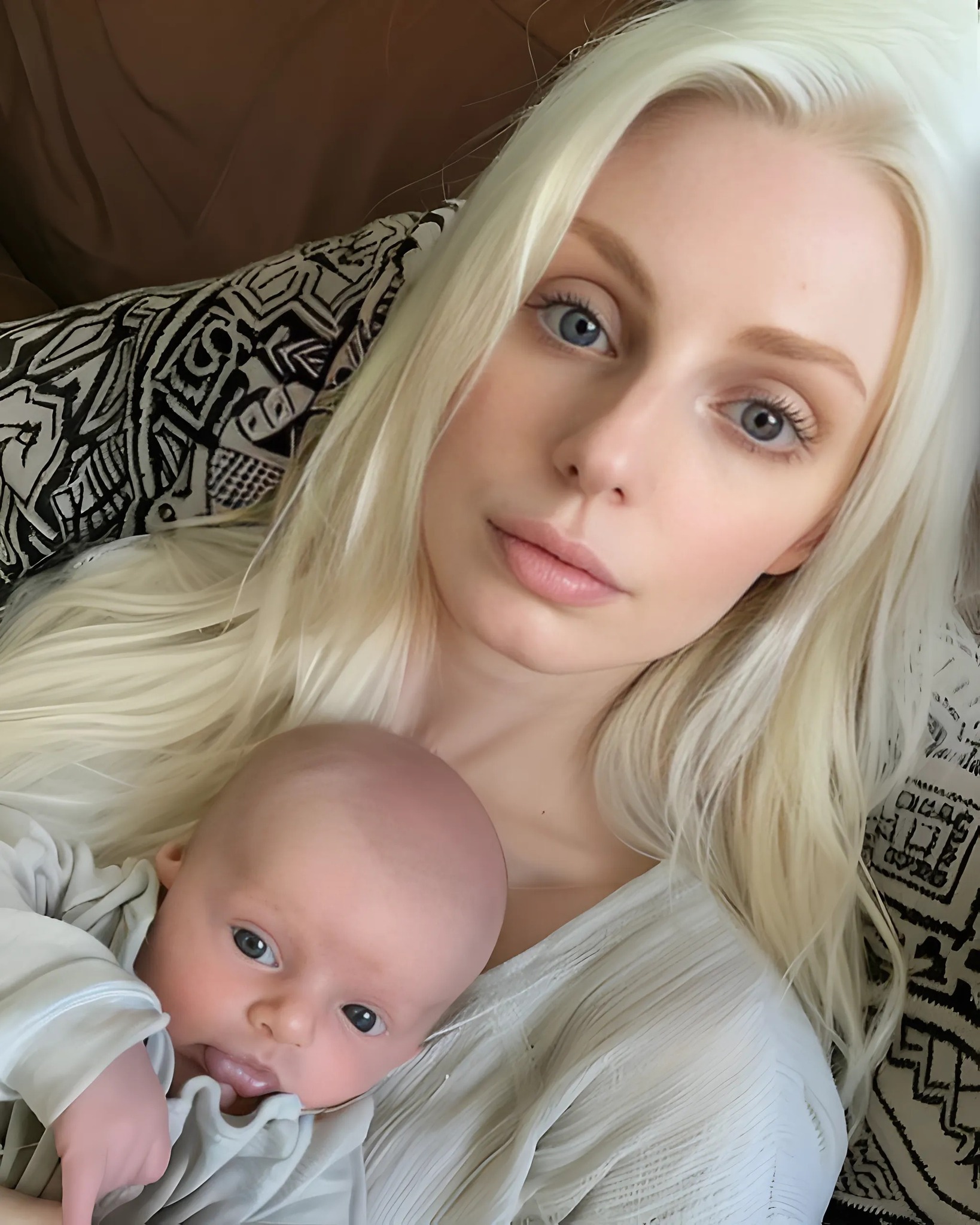 Na zdjęciu kobieta o smutnych oczach trzymała na rękach dziecko w niebieskim kombinezonie.
