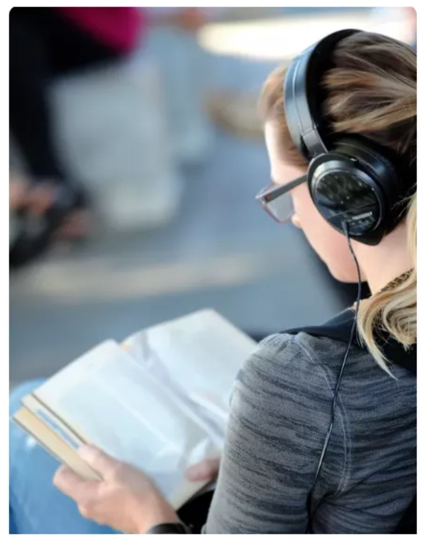 Jennifer siedziała przy oknie w słuchawkach i czytała książkę.