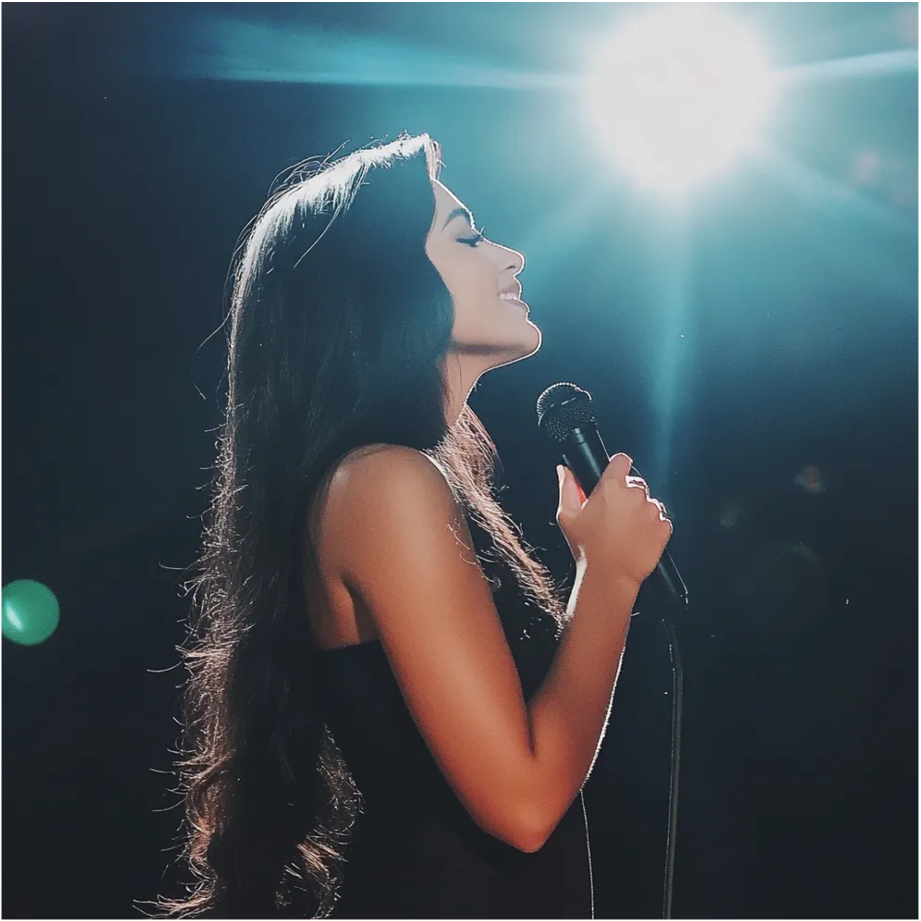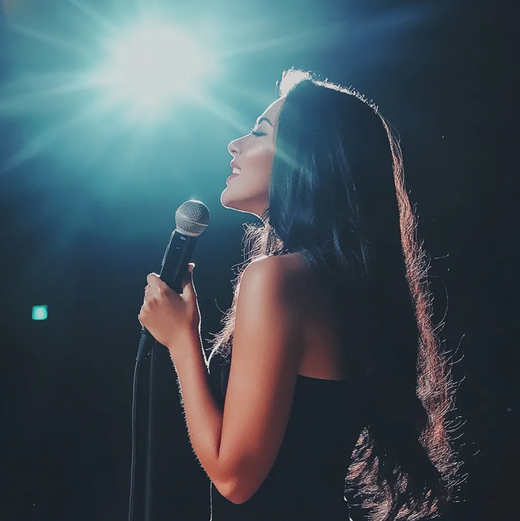 Jasne światła sceny. Mikrofon w dłoni. Jej ciemne włosy opadały kaskadą na ramiona.
