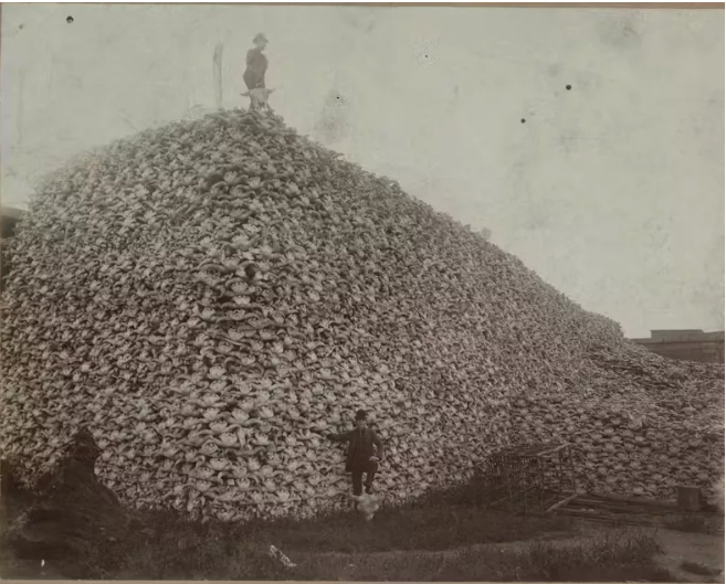 Na początku XIX wieku w Ameryce Północnej żyło od 30 do 60 milionów bizonów. Do czasu wykonania tego zdjęcia ich liczba spadła do oszałamiającego minimum — zaledwie 456 dzikich bizonów. Ekspansja osadników na zachód, a także popyt rynkowy na skóry i kości bizonów doprowadziły do brutalnego wytępienia niegdyś kwitnących stad. W okresie od 1850 do końca lat 70. XIX wieku większość stad została zniszczona, pozostawiając po sobie zarówno ekologiczne, jak i kulturowe spustoszenie.