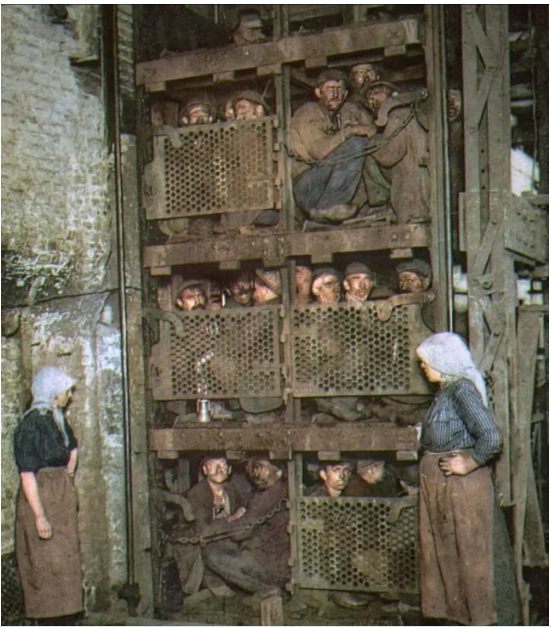 Na początku lat 20. XX wieku belgijscy górnicy przeżywali ciężkie dni pod ziemią, pracując w niebezpiecznych warunkach, aby zapewnić paliwo dla rozwijającej się rewolucji przemysłowej. Po wielu godzinach wyczerpującej pracy w ciemnościach tłoczyli się w przepełnionej windzie i w końcu wychodzili na światło dzienne. Skrzypienie windy i cichy szum ich głosów pokazują, jak bardzo byli od siebie zależni.