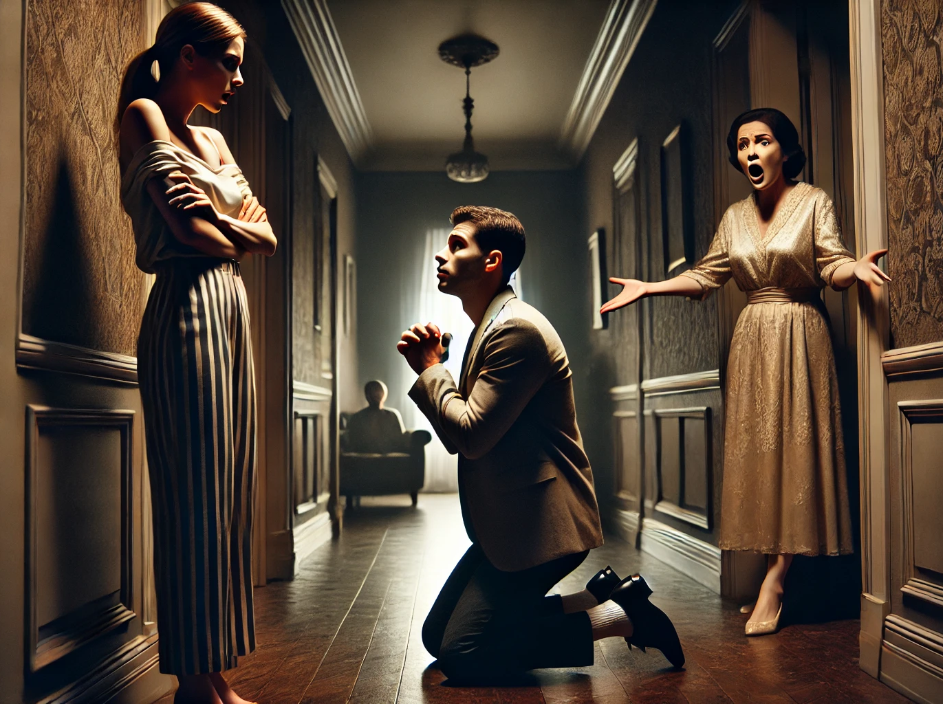 Podszedłam ostrożnie i zobaczyłam scenę, która zmroziła mi krew w żyłach: Matteo klęczał przed moją matką, a po jego twarzy spływały łzy.